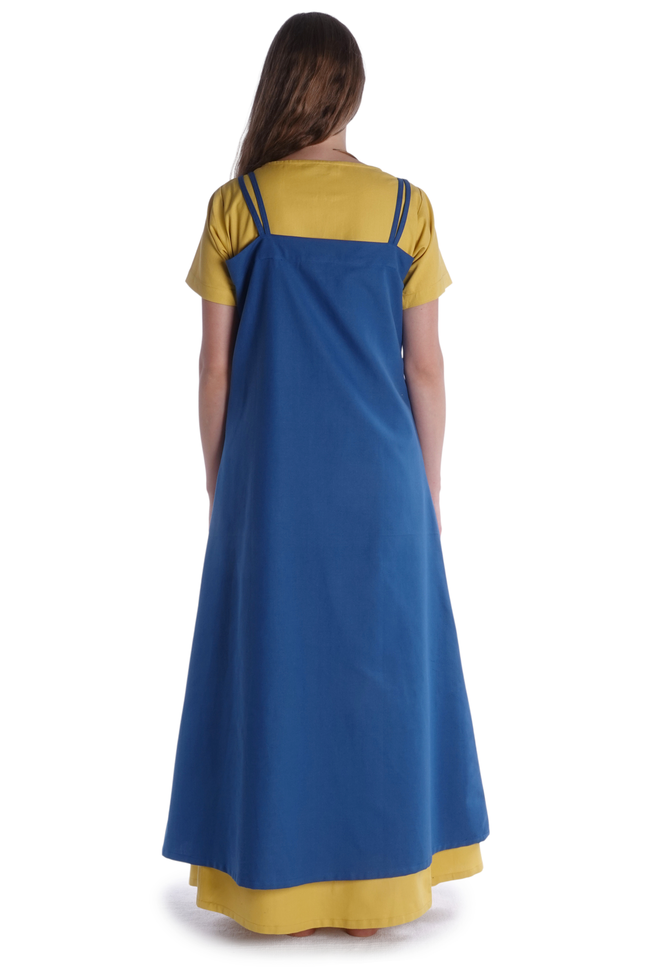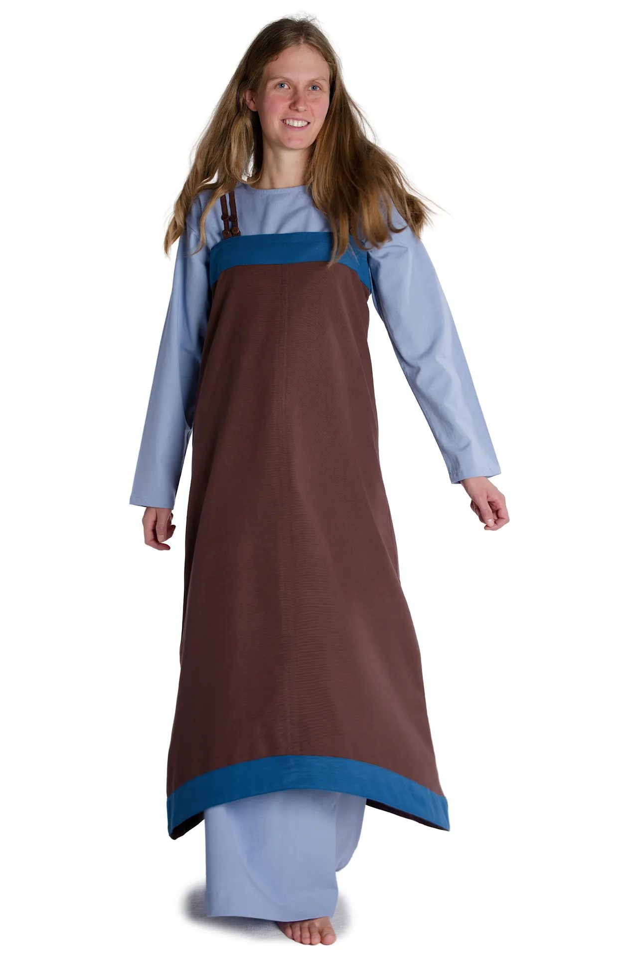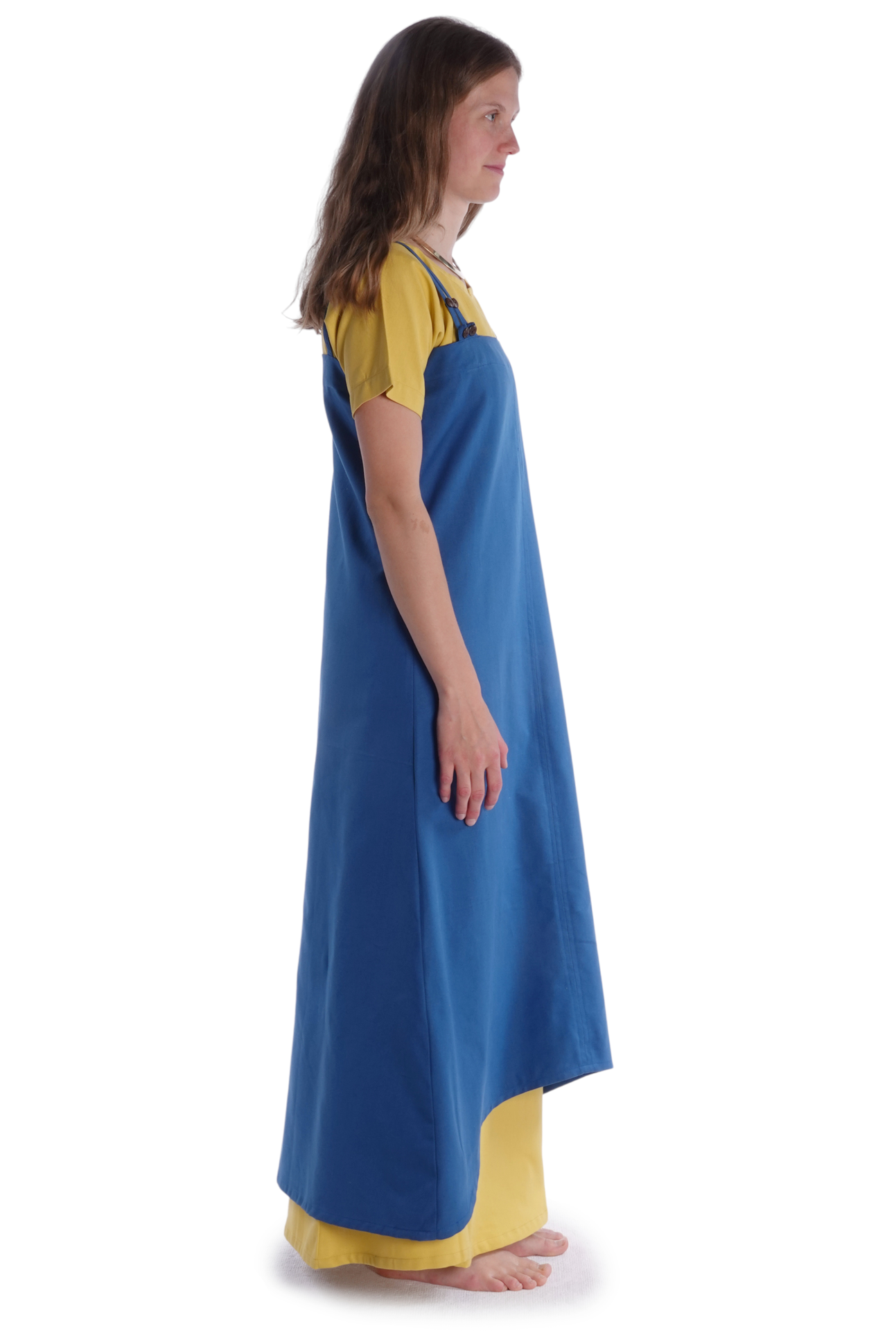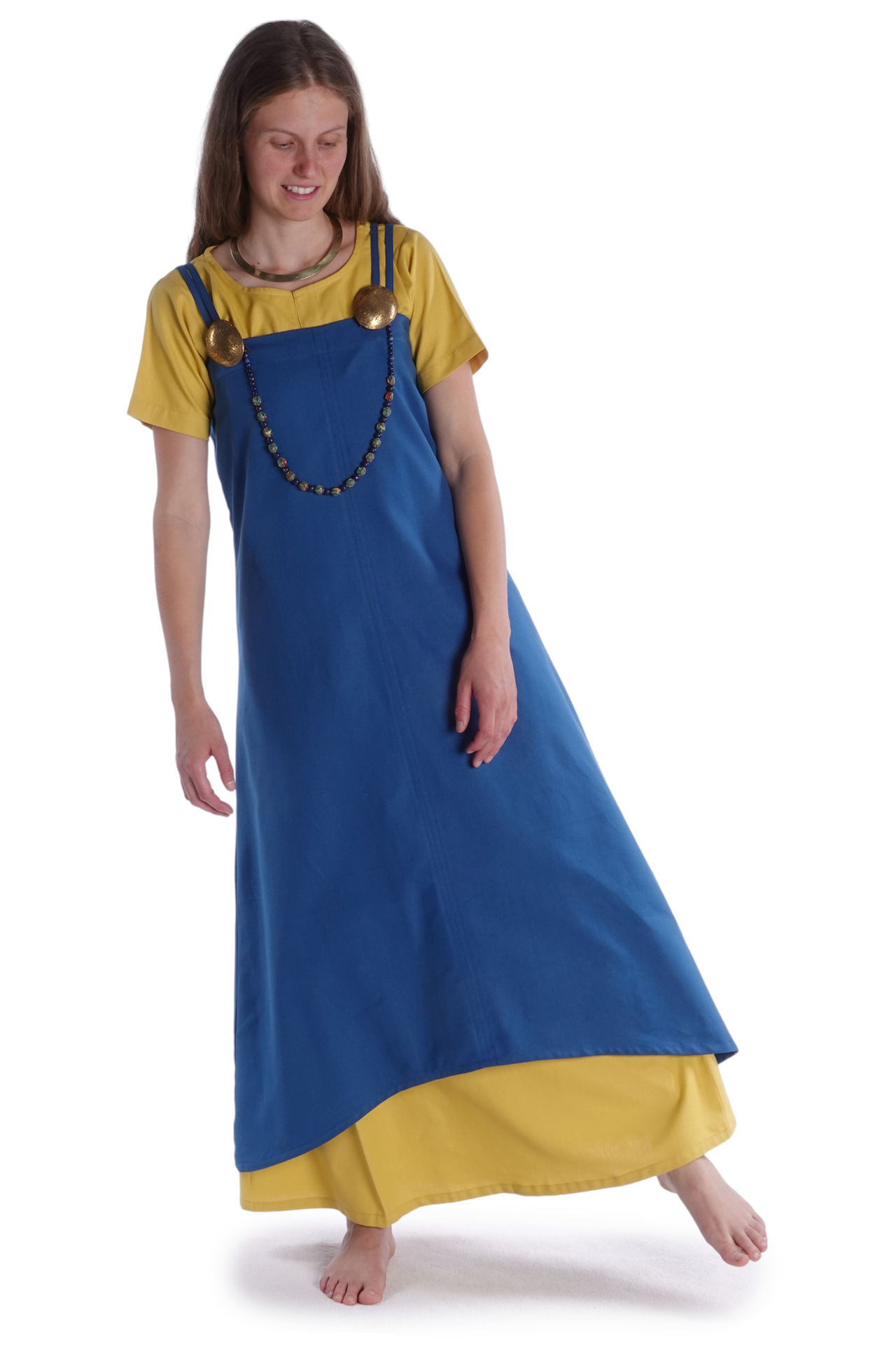 Für die Damengewandung der Wikinger (ca. 750 – 1050), wie auch des gesamten Mittelalters, sind Oberkleider - die sog. Surkots - typisch, die über dem Unterkleid (beispielsweise Kleid „Verandi“ unseres Sortiments) getragen wurden. Das für die Frauenkleidung der nordeuropäischen und baltischen Volksstämme des Frühmittelalters typische Obergewand wird als Hängerock, Trägerkleid oder auch Trägerschürze der Wikingerinnen bezeichnet. Die archäologischen Textilfunde der Wikingerstädte Birka (8. – 10. Jahrhundert) und Haithabu (9. – 11. Jahrhundert) belegen dieses geschichtlich authentische Kleidungsstück. Dieses Kleidungsstück war ärmellos, fußlang und rundum geschlossen. An den Schultern wurde die Trägerschürze mittels Schulterbändern und Fibeln gehalten. Weiterhin war der Hängerock oben röhrenartig geschnitten und wurde nach unten hin immer weiter. Außerdem ließ das Trägerkleid der Wikingerdamen auf der Vorderseite den Blick auf das Unterkleid zu.