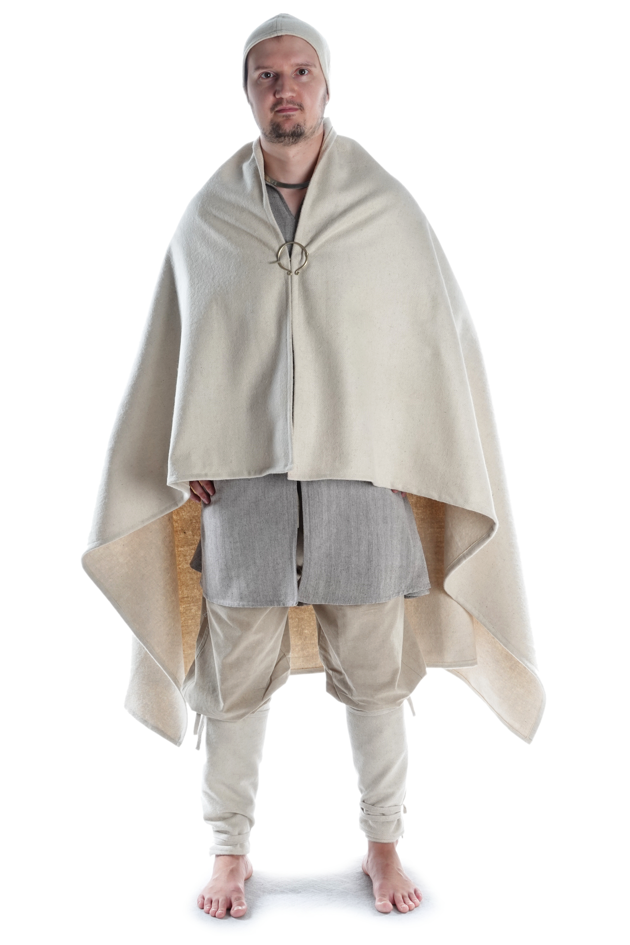 Der Umhang "Hakon" ist inspiriert von der Wikinger-Epoche. Wikinger trugen häufig Umhänge aus Wolle, die sie vor dem rauen Klima schützten. Die Verwendung einer Gewandnadel (Fibel) ist typisch für die handwerklichen Fertigkeiten der Wikingerzeit und verleiht dem Umhang einen authentischen Look. Rechteckige Mäntel oder Überwürfe waren ein gängiges Kleidungsstück in der Wikingerzeit und im Frühmittelalter. Sie wurden aus verschiedenen Materialien wie Wolle hergestellt und boten sowohl Schutz vor dem Wetter als auch eine Möglichkeit, den sozialen Status zu zeigen. Die Art und Weise, wie ein Mantel getragen wurde, konnte Auskunft über den sozialen Status und die regionale Herkunft geben. Historische Informationen zu diesem Thema finden Sie in unserem Glossar über historische Gewandungen.