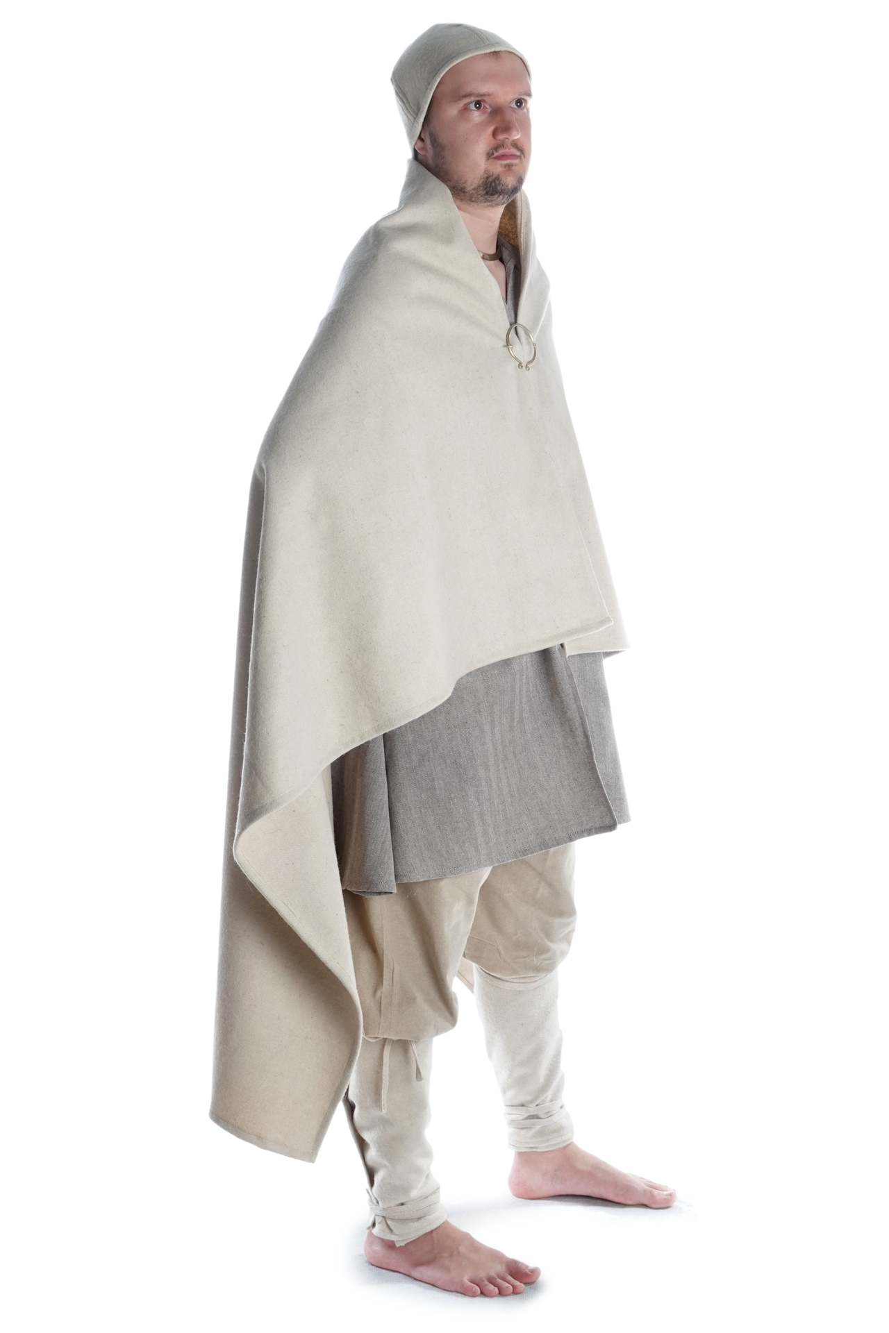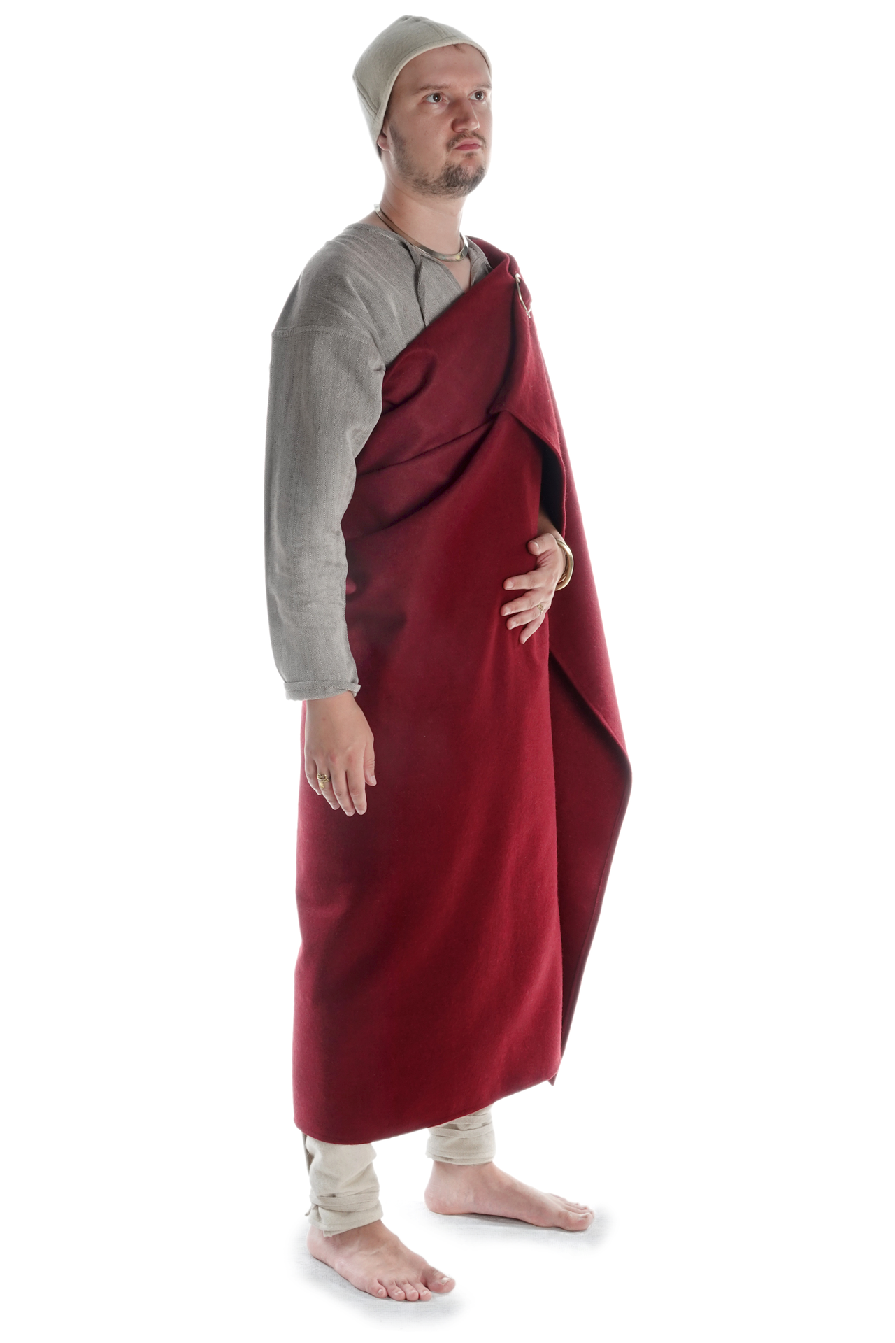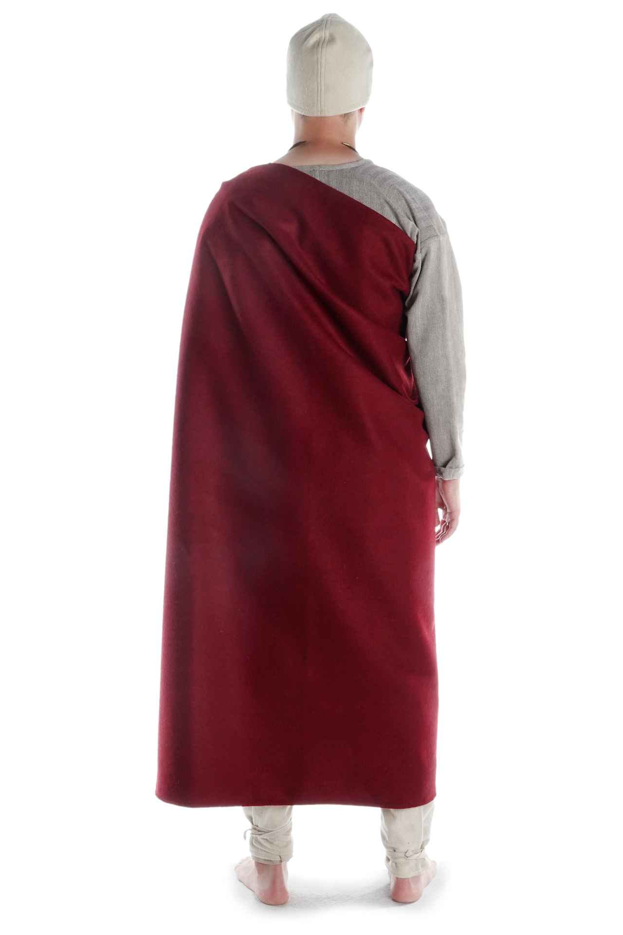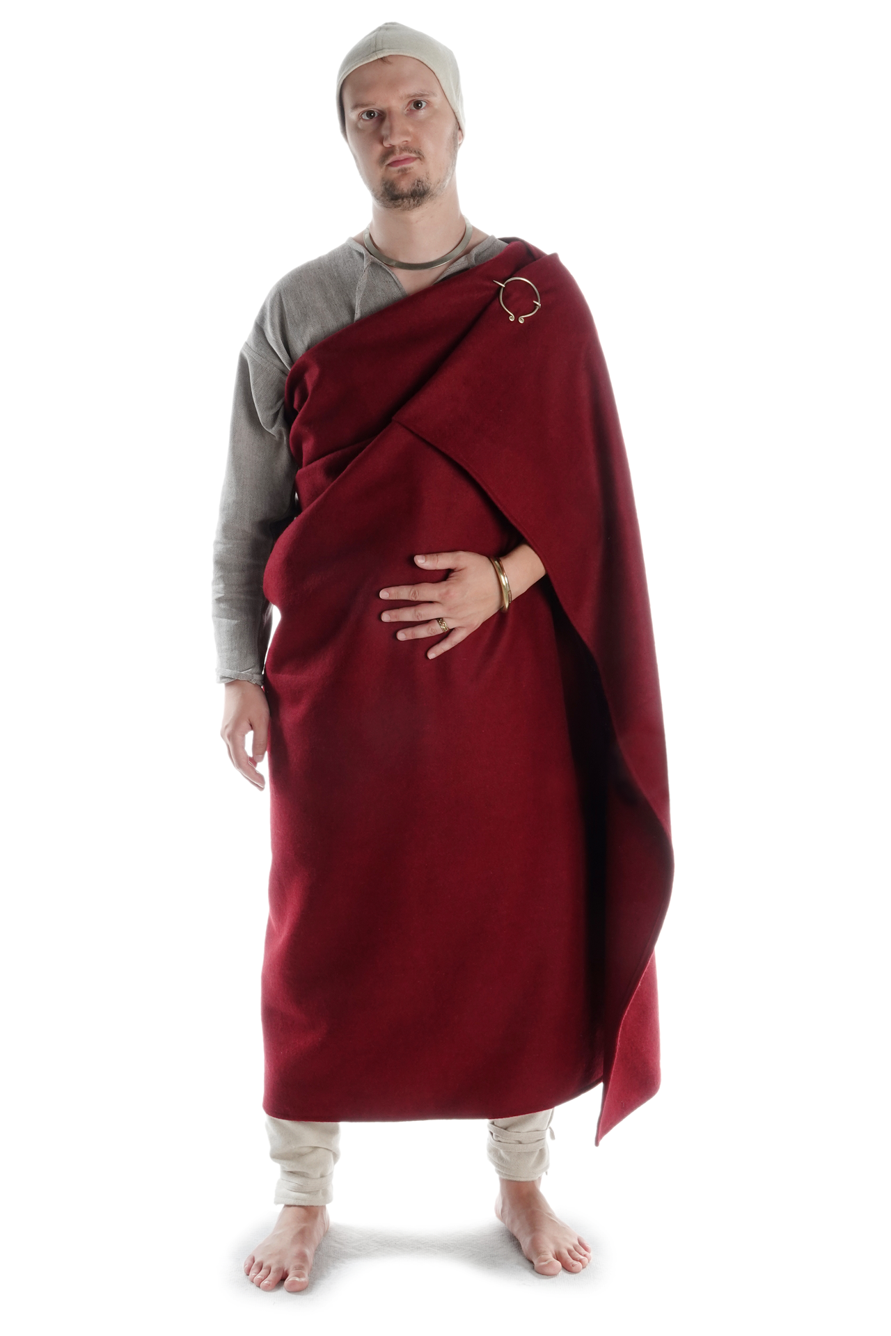 Kennzeichnend für unser Modell "Hakon" ist das rechteckige Design, das typisch für das Frühmittelalter und die Wikingerzeit ist. Der Mantel wird mit einer Gewandnadel (Fibel) verschlossen, die separat erworben werden muss, was dem Umhang ein authentisches Aussehen verleiht. Die Farben bieten vielfältige Kombinationsmöglichkeiten mit anderen historischen Kleidungsstücken. Der Umhang ist locker geschnitten, um möglichst große Bewegungsfreiheit zu ermöglichen und bietet hohen Tragekomfort. Dieser Umhang wird in Einheitsgröße angeboten, die für eine Vielzahl von Körpergrößen und -formen geeignet ist.