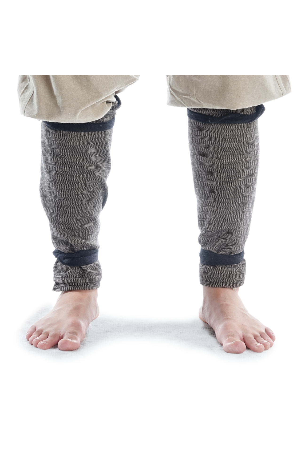 - Design: Schlicht und funktional, rechteckige Baumwollstücke um das Bein gewickelt und mit Schnüren gebunden